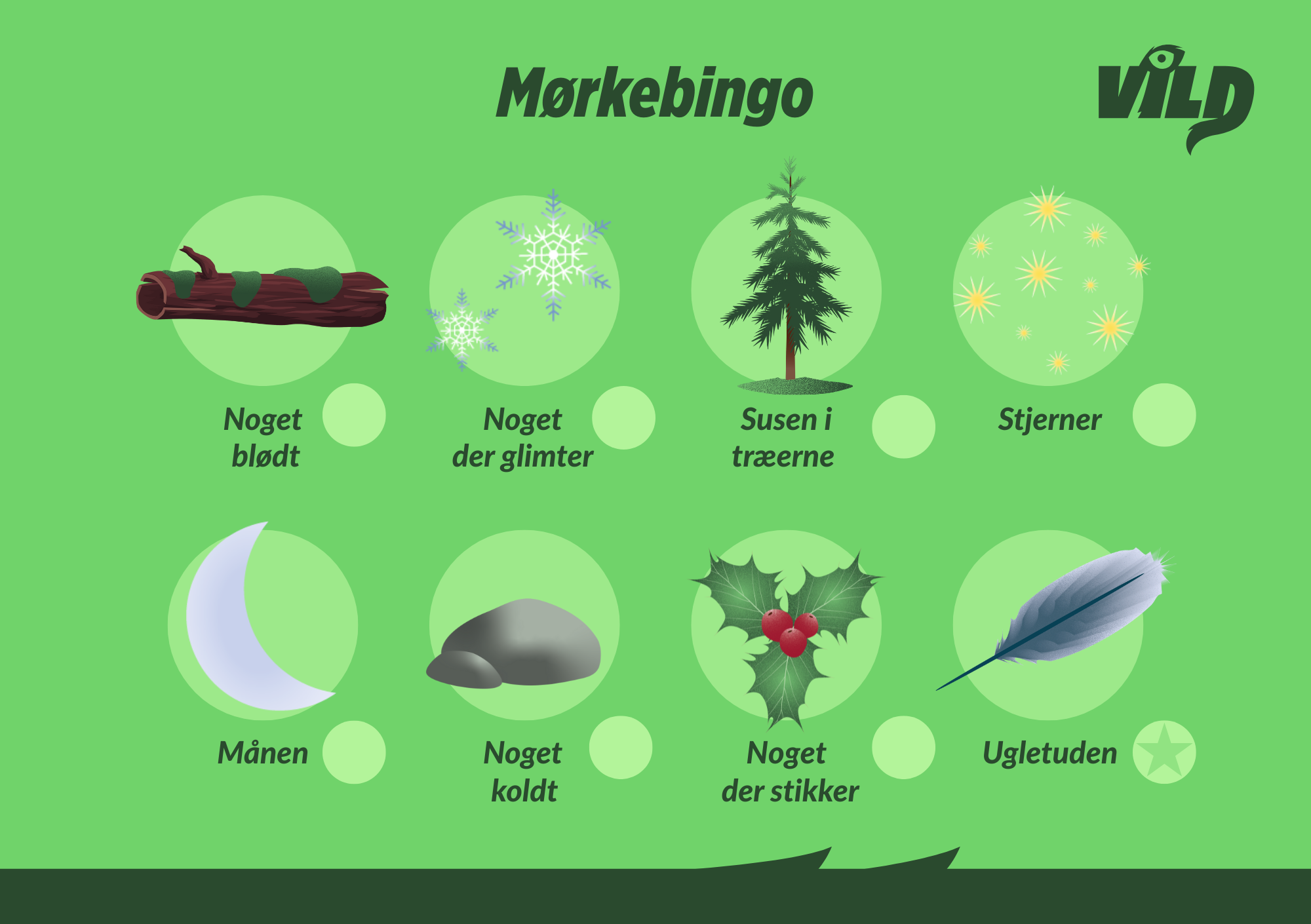 Test jeres superkræfter i nattens mulm og mørke, og se om I kan blive de sejeste skattejægere til mørkebingo. Start med at finde det mørkeste sted I kan forestille jer i naturen – det kunne f.eks. være en skov, et hjørne af den nærmeste park eller nede i bunden af jeres have.